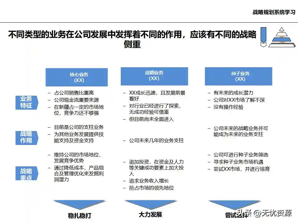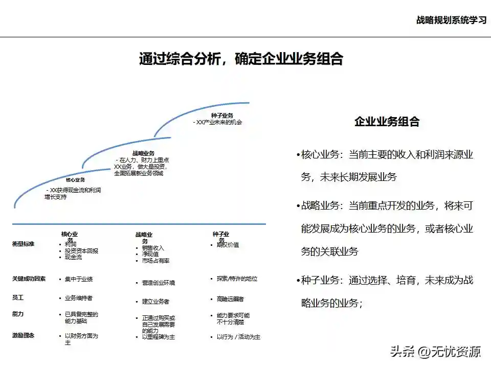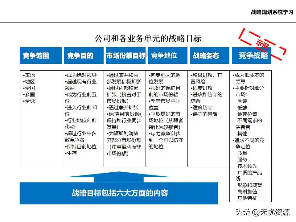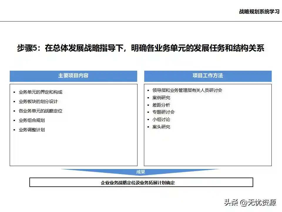 (五)在总体发展战略指导下,明确各业务单元的发展任务和结构关系在总体发展战略指导下,明确各业务单元的发展任务和结构关系。这包括业务单元的界定和构成、业务板块的划分设计、各业务单元的战略定位、业务组合规划、业务调整计划等。
