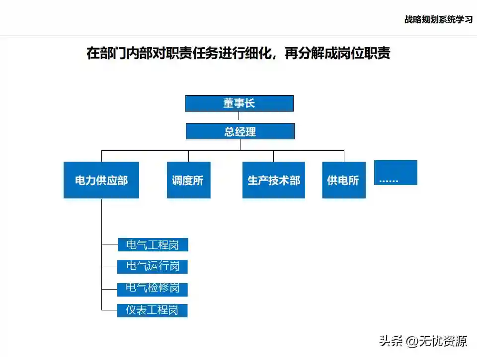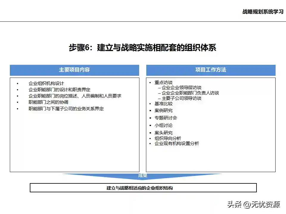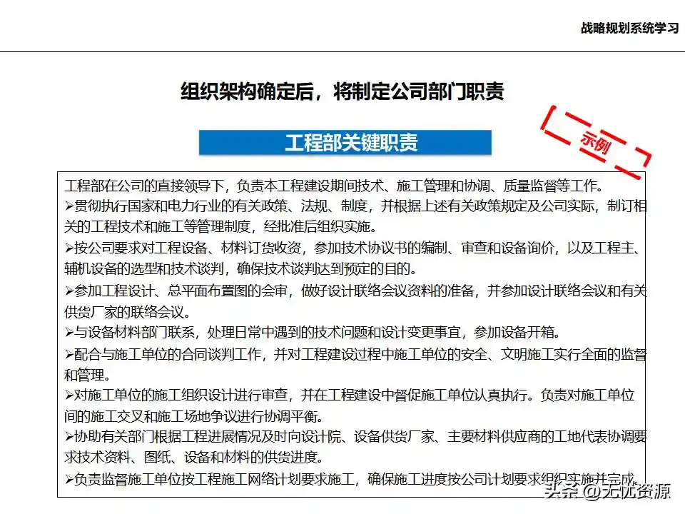 (六)建立与战略实施相配套的组织体系建立与战略实施相配套的组织体系,包括企业组织机构设计、企业职能部门的设计和职责界定、企业职能部门的岗位描述、人员编制和人员要求,以及职能部门之间的协调等。
