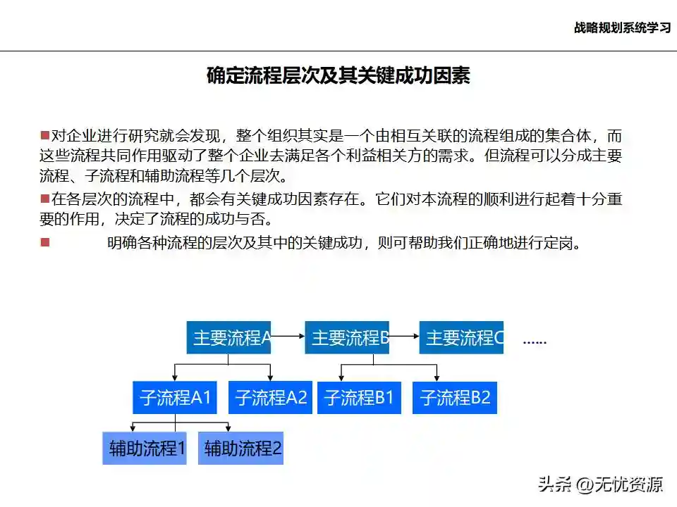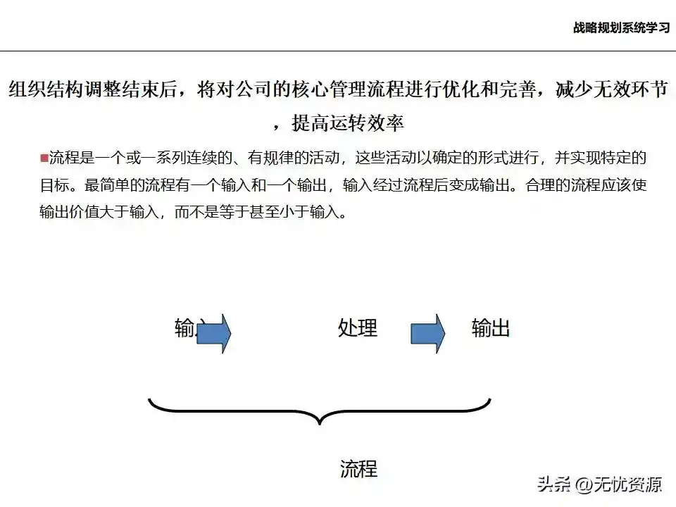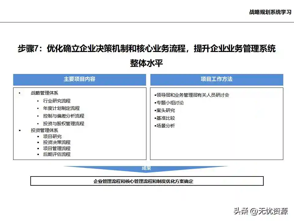 (七)优化确立企业决策机制和核心业务流程,提升企业业务管理系统整体水平优化确立企业决策机制和核心业务流程,提升企业业务管理系统整体水平。这涉及战略管理体系、行业研究流程、年度计划制定流程、控制与偏差分析流程、投资与股权管理流程等。