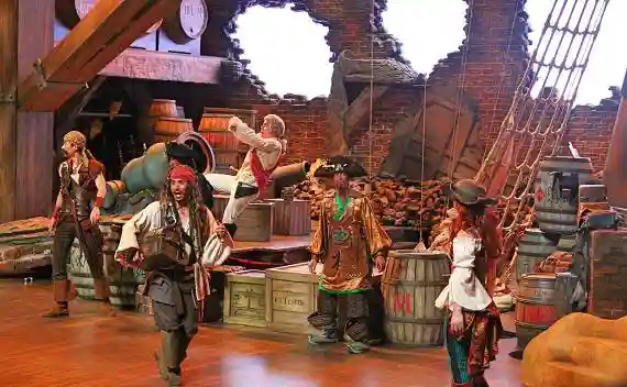 宝藏湾执行创意总监卢克·梅兰德介绍说,宝藏湾创造的是数百年前加勒比村庄的场景,体现的是海盗的浪漫和冒险。电影只是提供了故事的素材,乐园则要将电影IP与游客产生联结,创造沉浸式的体验。这就需要幻想工程师们用不同的手法来讲述海盗故事。一种是用现代科技手段展示。“加勒比海盗——沉落宝藏之战”采用全新的驾乘系统,创造出超越3D的个性化玩乐体验,扮成海盗的游客在惊险刺激中,由杰克船长带领偷走戴维·琼斯船长最珍贵的宝藏。二是互动游戏设计。“船奇戏水滩”里,孩子们在不幸搁浅的船只上假扮海盗用水枪互打水仗;三是用戏剧表演再现海盗的故事。凡迭戈剧院演出前扮演成海盗的演员与观众互动,让观众从步入剧场的那一刻起便成为演出的一份子。更不用说演出过程中采用的奇幻特技给现场观众带来的惊人的视觉效果。