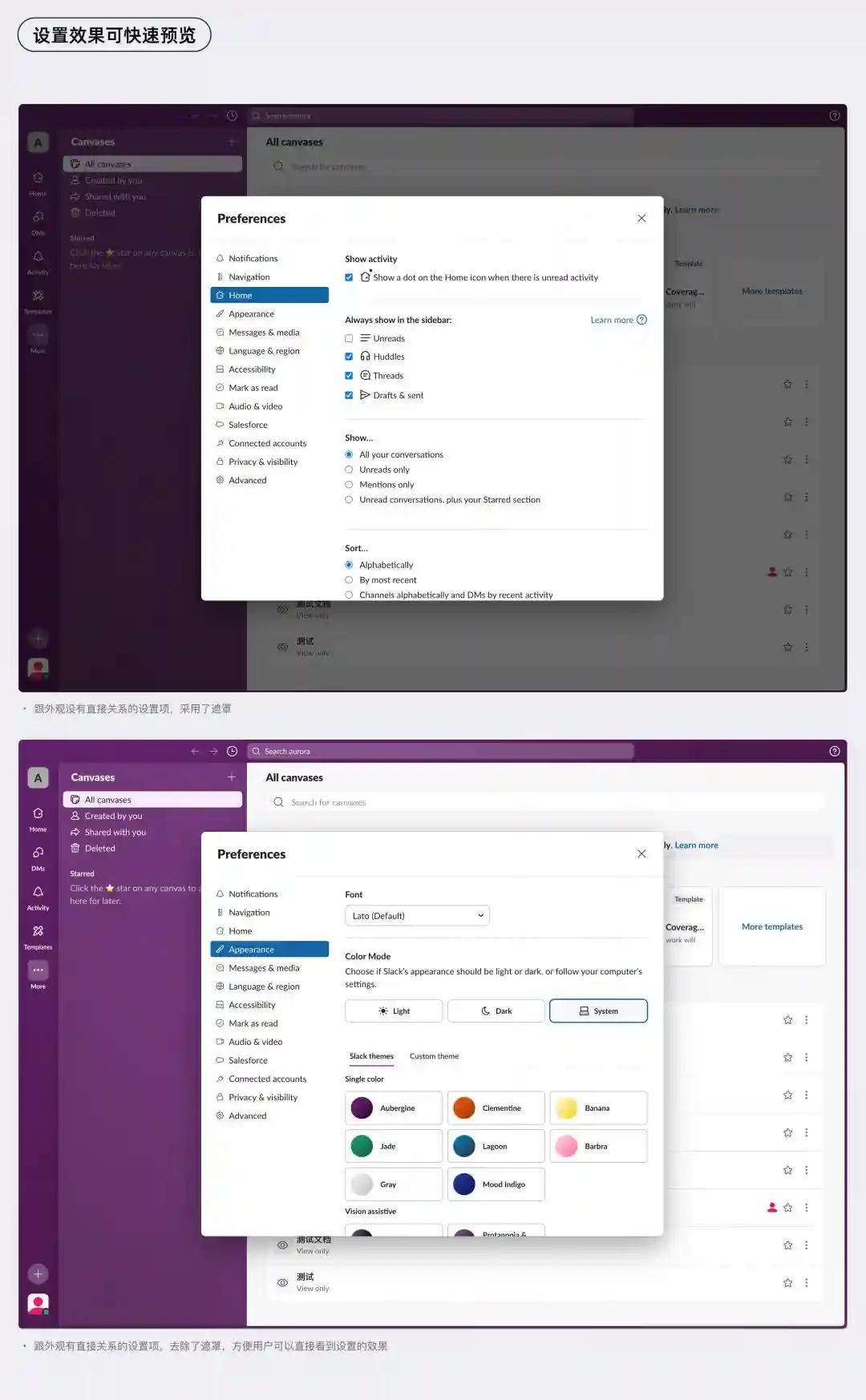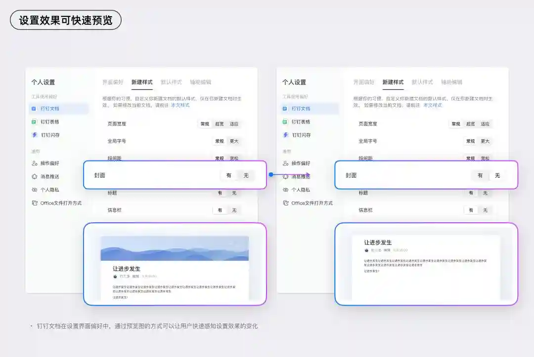 钉钉文档的界面偏好设置则是通过一张动态变化的示意片,让用户感知到设置后界面的变化。