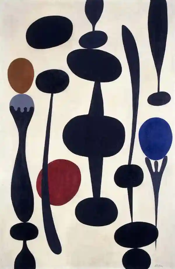 在这个展览上,观众还将看到PauleVézelay的作品,她是英国最早的抽象派画家之一。她于1892出生于布里斯托尔,在早年的一次去往巴黎的旅行中,她将自己平凡乏味的英文名改为PauleVézelay。观众将在展览上看到她于1938年创作的《剪影》——在画布上,一些形态奇异的生物体,让人联想起植物、水果甚至是感叹号,群青色、黑色和苍白的画布相呼应,这一系列物体仿佛在你眼前陡然起舞。战争爆发后,PauleVézelay没能随身带走这幅画,好在这幅画被完整地保存了下来,可惜的是,她的很多作品都在战争中损毁或流失了。