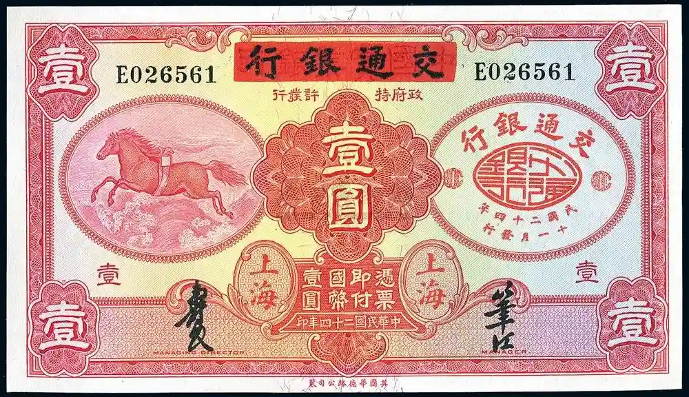 第四版是民国24年版,正面图案仍旧采用飞马图,但只发行了1元一种面值,收藏难度也不大。这张纸币刚印制出来还未发行,赶上了国民政府的法币政策,于是把银行名称进行了涂改,改为交通银行,并加盖了一个交通银行的一个戳记。