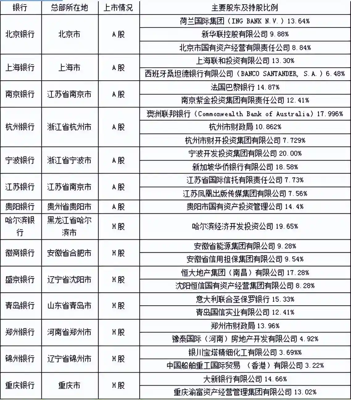 上篇讲述6大国有银行之后,我们今天先来看是12家全国性股份制商业银行。下面不再一一列表,只备注几个主要股东及其持股比例①。