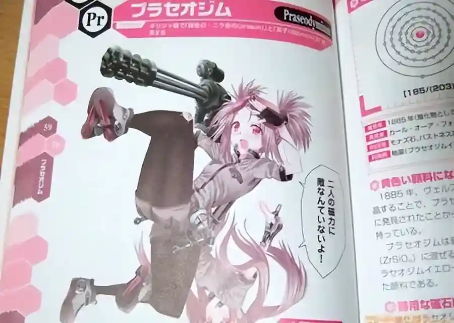 这是日本的化学课本,每一个元素都以拟人化呈现,点子不错,但在日本国内也引起过争议,原因是持枪以及裸露程度高。