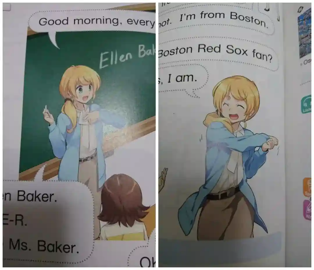 近年教材进行了改版,画风变得更加二次元了,其中EllenBaker这个英语老师的角色因为过于卡哇伊,引来不少粉丝。