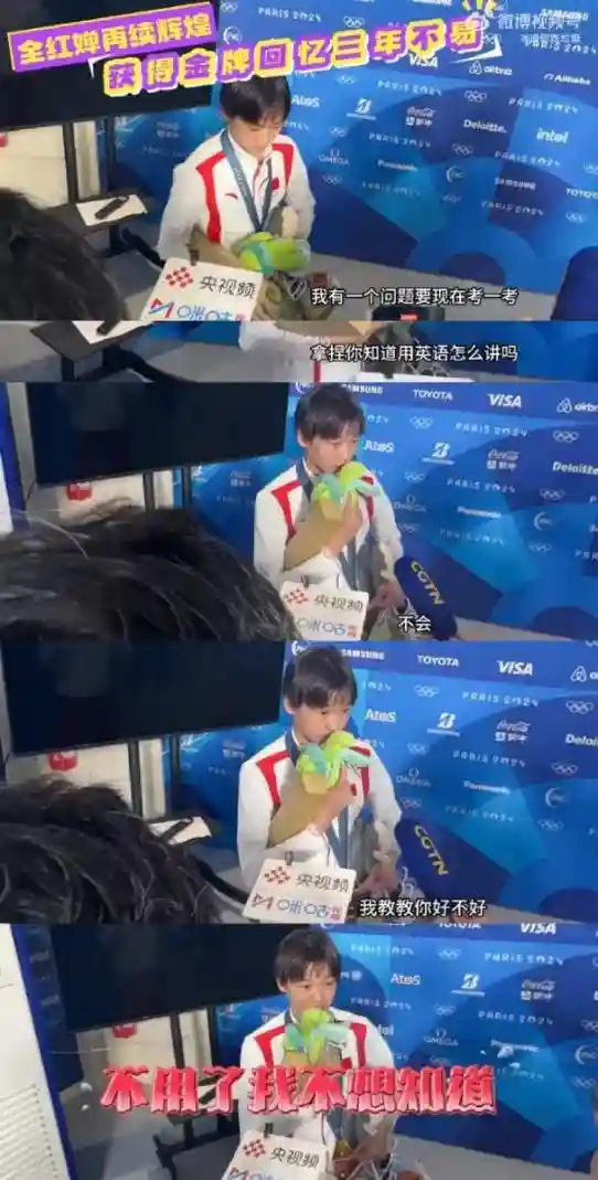有个记者考全红婵知不知道“拿捏”用英语怎么讲,得到了否定回答后,舔着脸要教人家,把全妹急得连连拒绝:不需要。