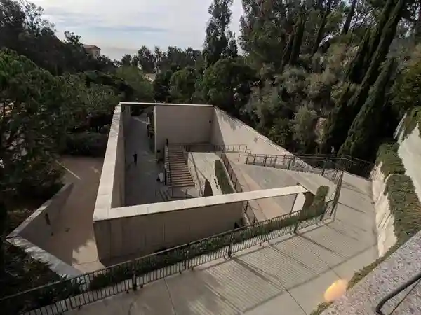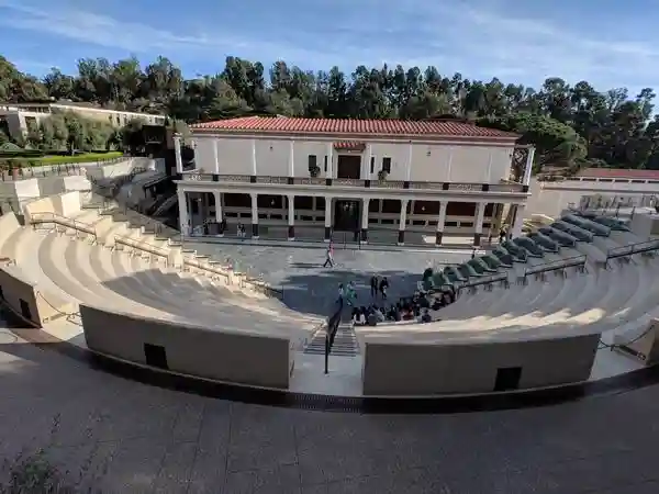 改建后的盖蒂别墅入场的体验很特别,从后花园地下的停车场出来,先进入一个面积不小的天井(图三,四),轻盈高耸的水泥墙围住一方南加州永恒的蓝天,可以看见周围山坡上茂密的树冠,拾级而上甚至看得见太平洋,就是看不见近在咫尺的博物馆。沿半山坡栈道往前走,偶尔在树丛的缝隙里瞥见些屋瓦,正有些转向,一座簇新的罗马别墅和半圆剧场猝不及防出现在脚下(图五)。