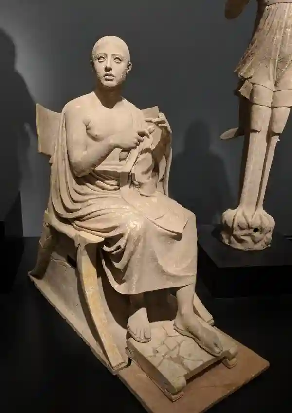 现在该来说说博物馆的展品。盖蒂别墅如今专收古代地中海世界的文物,好东西真不少,其中让我们一见钟情的,每次重逢都走不动道的,每次分开要一再告别的,是三个接近真人大小的塔兰托泥人(图十一)。半人半鸟的两位女士,一位单手托腮,象在沉思,另一位嘴唇半张,摆出唱歌剧的手势(图十二、十三),显然是希腊神话中的塞壬。在荷马史诗里,塞壬以致命的歌喉诱惑水手葬身鱼腹,只有奥德修斯这样有备而来的人可以逃过一劫。但塞壬也不是永远只干这一件事,古希腊人相信她们也是冥府女王珀耳塞福涅的随从,甚至是黄泉下的缪斯,她们是墓碑、陪葬的雕塑和陶器上常见的形象。