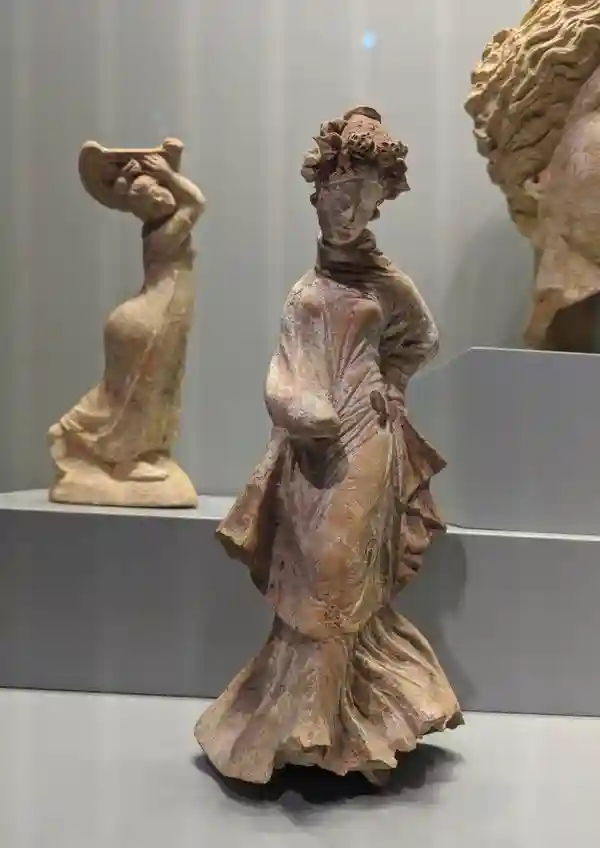 坐着的男人正在弹琴,手里的琴已经破损,说明牌上认定这人是俄耳甫斯(图十四)。诗人和歌手俄耳甫斯,有人说他是阿波罗的儿子,有人说他的母亲是九缪斯中的大姐,掌管音乐和舞蹈的卡利俄佩。他走哪儿都带着把小琴,有一生唱不完的歌,曾为自己死去的新娘下过阴间又活着回来。在古希腊传说中,能去冥府走一遭又全身而退的凡人很少,奥德修斯干过一次,去那边找人问路助他回家,俄耳甫斯是另一位,去救他的爱人,他的歌打动了冥王的心,可终究改变不了生死,他的新娘没能跟他一起回来,他自己后来也死了。在阴间的这番闯荡使他成为古希腊丧葬艺术中一个熟悉的主题,人们也许企望从他那里得到与死去的亲人相见的法子,也许希冀着在那暗无天日的地方还有他的歌可以听,总之墓室中有他的雕塑也是很合情理的,这也可以解释这些造于公元前四世纪的陶俑何以保存如此完好。