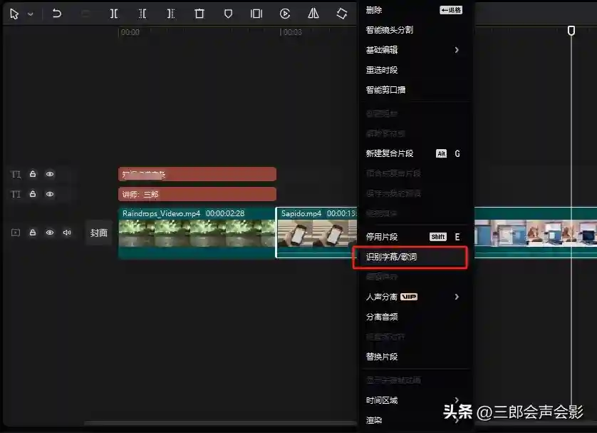 或者在轨道的素材上直接右击,在打开的子菜单中单击“识别字幕/歌词”,如下图所示;