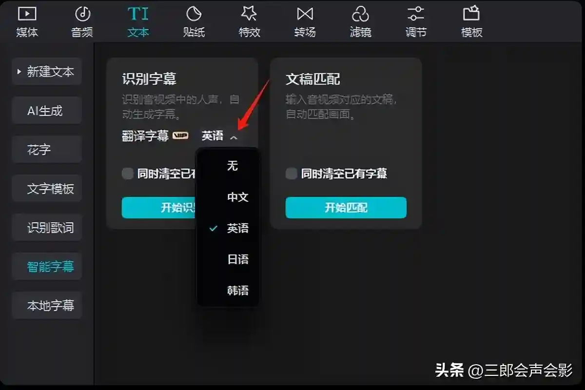 如果仅仅是语音转文字,上述任一方法都是可以的;但是如果想在语音转文字的同时自动翻译成中文、英文、日语和韩语,实现双语效果,就必须要使用“智能字幕”里的“开始识别”功能!