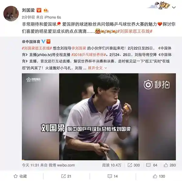 今年2月,刘国梁开始担任某直播平台的解说嘉宾,他也相继解说了乒乓球世界杯和世乒赛。
