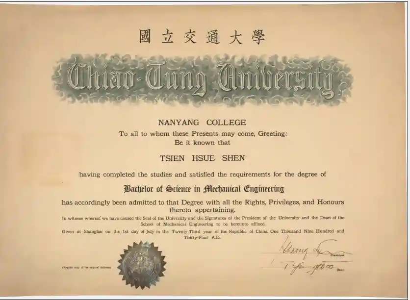 1934年国立交通大学颁发给钱学森的学士学位证书(英文)