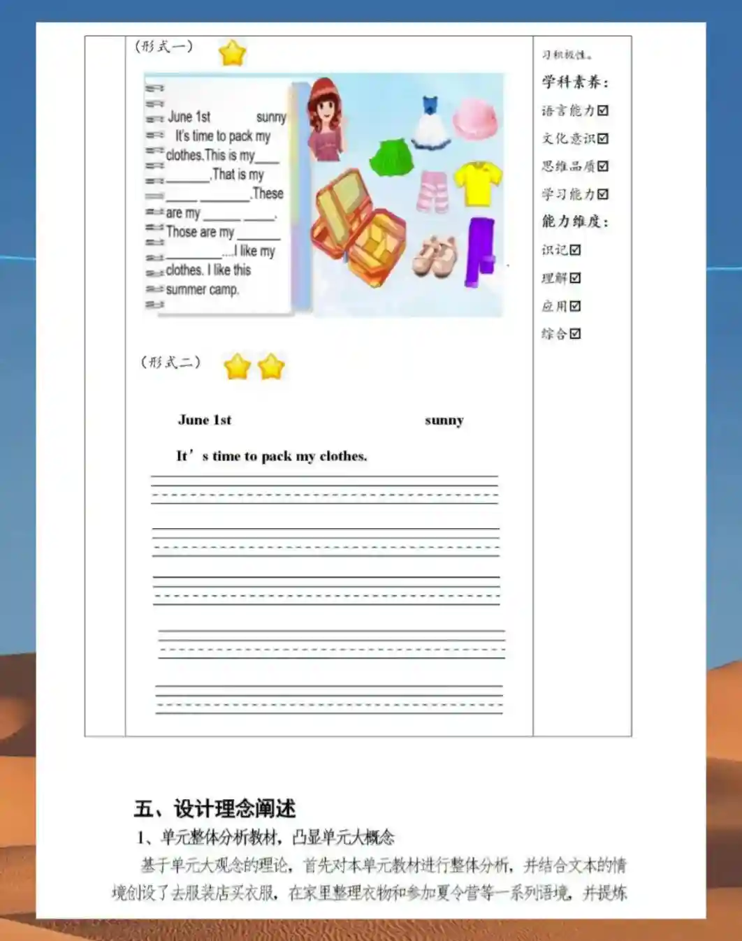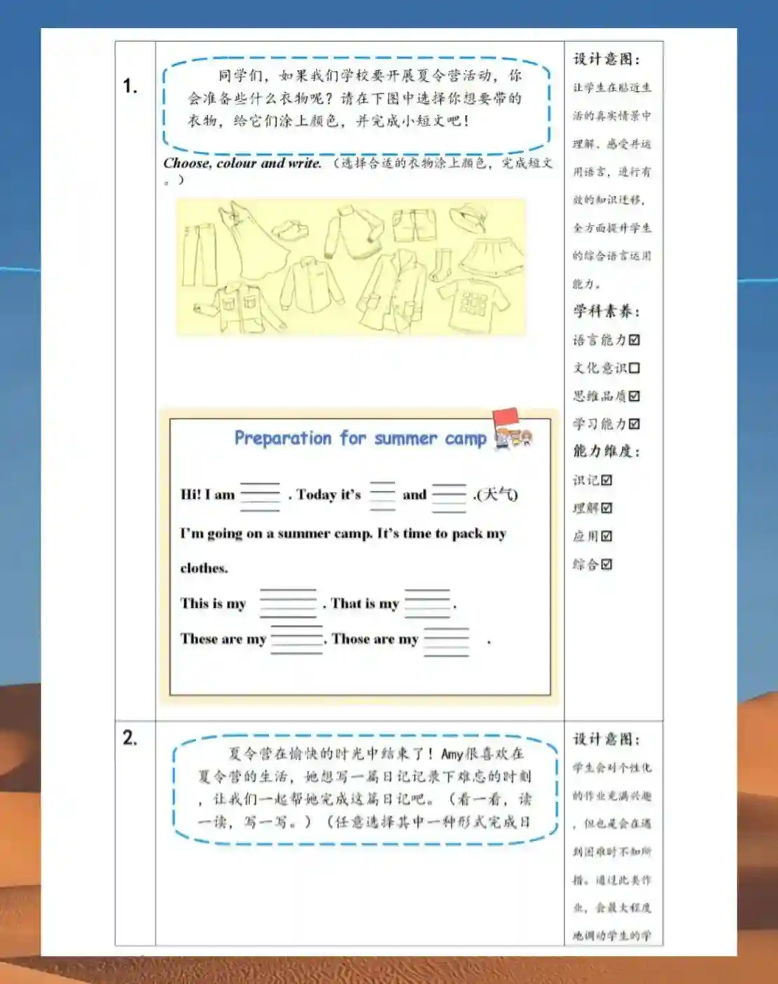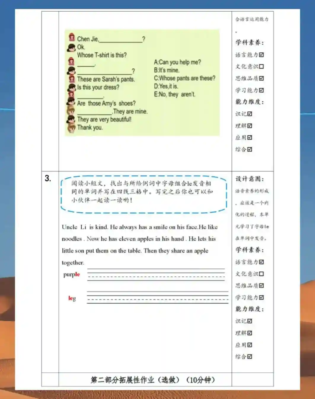 1、通过作业活动,复习、巩固本单元所学词汇、句型,能够在情境中正确且熟练运用介绍衣物类的单词,以及句型能够在情景中运用句型