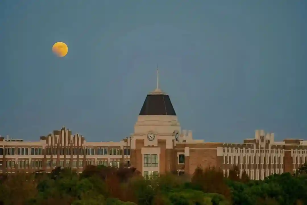 上海工商职业技术学院的校园里,孟秋轻寒,落霞满天,余晖斜照图书馆。