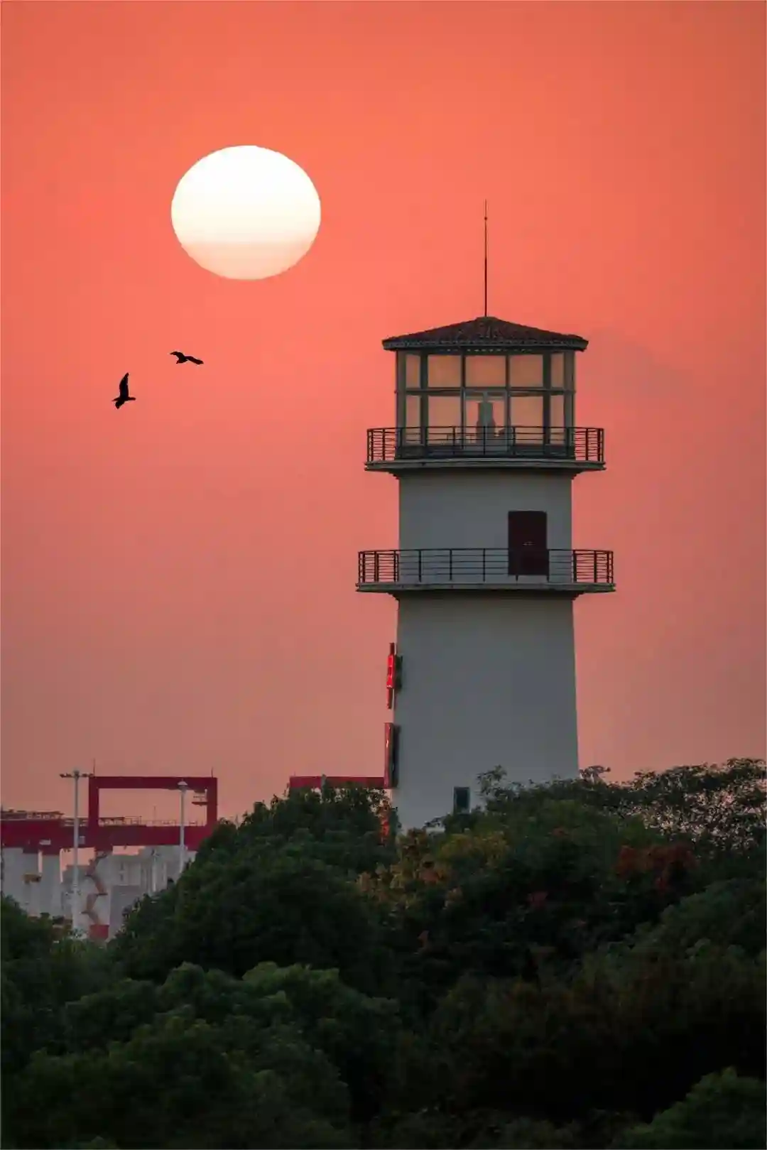上海海事大学伫立在滴水湖畔,秋高气爽,落日与灯塔相映成趣。晚风微徐,夕阳携着草地的清新味道,让海大校园沁人心脾,身心舒畅。