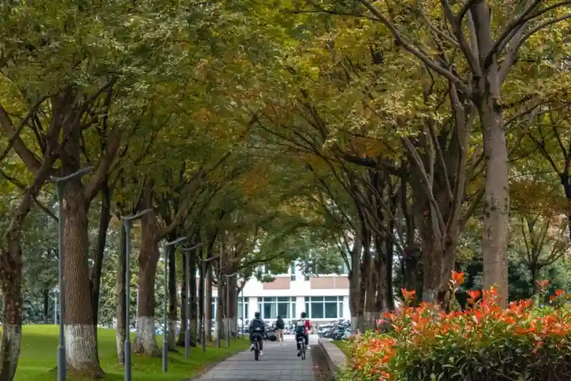 上海济光职业技术学院的校园,目光所及的秋天,是微风吹,叶儿飞,一派美好景象。