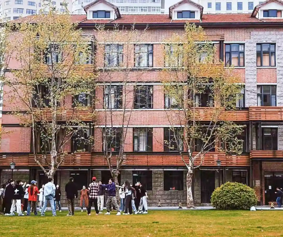 上海戏剧学院的红楼前一片金灿灿,满眼秋色,学生们在草坪上进行戏剧传递练习,感受秋日凉爽。