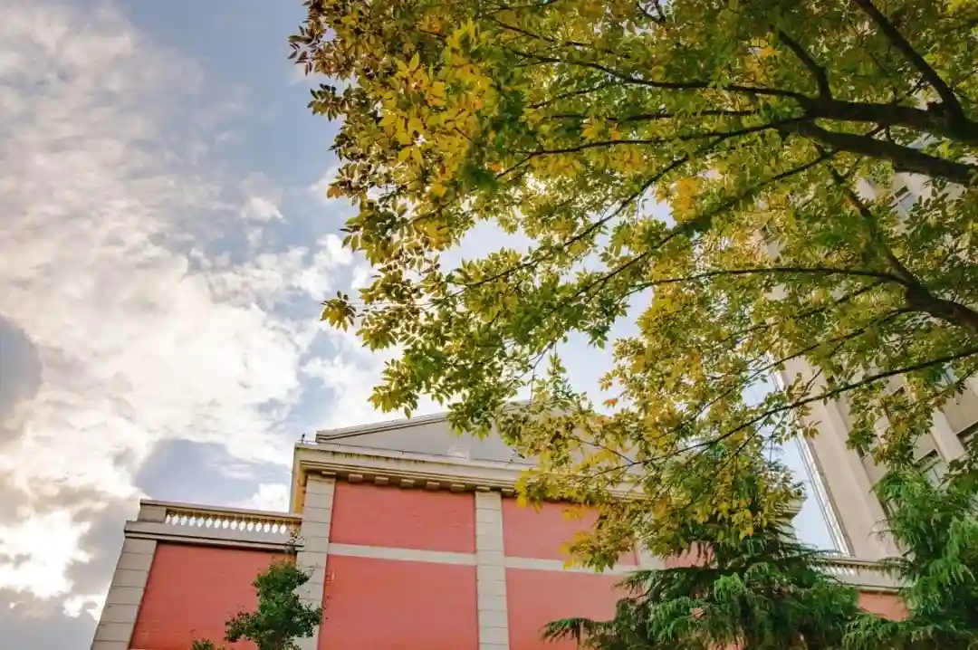 上海音乐学院的贺绿汀音乐厅前树叶渐黄,秋日暖阳照耀在红墙白瓦上,勾勒出浓烈而灿烂的绚丽风光。