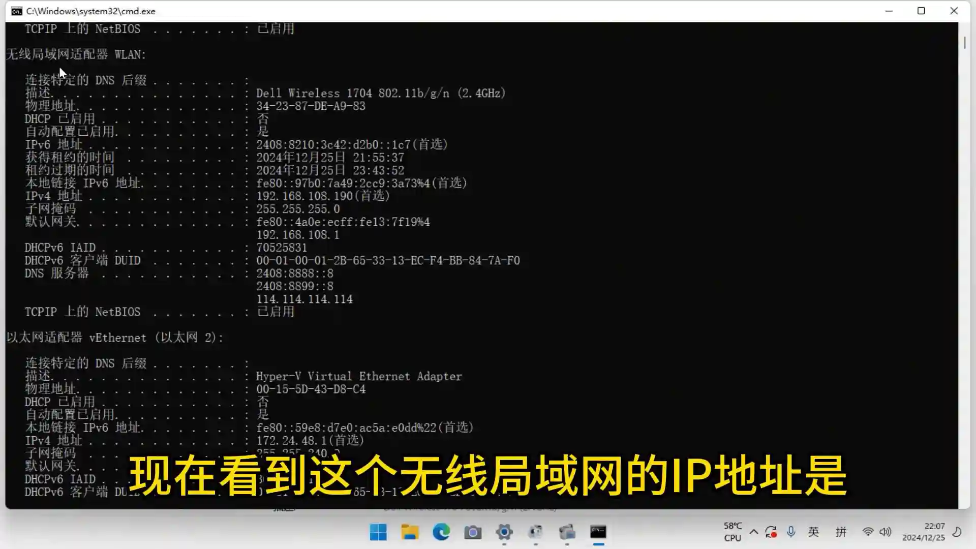 通过win加r输入CMD,IPconfig查看一下IP地址。现在看到无线局域网的IP地址是192.168.108.190,DHCP已启用否,这个是IPV4的地址,刚才设置的就是这个。但是查看原先的网络和共享中心的时候,这就是刚才无线的连接。