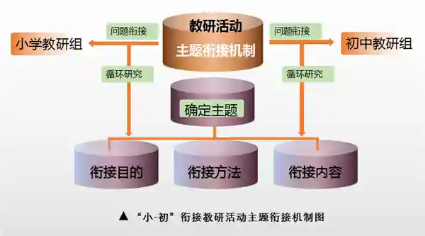 教研活动主题引领衔接机制以问题为驱动、课例为载体。如:以语文学科“小-初”衔接教研为例:将语文“小-初”衔接教研主题分解为以下四个分题:语文课程标准“小-初”衔接、语文教学内容“小-初”衔接、语文教学方法“小-初”衔接和语文学习方法“小-初”衔接,教研组教师分别选取研究课题进行研究实践。
