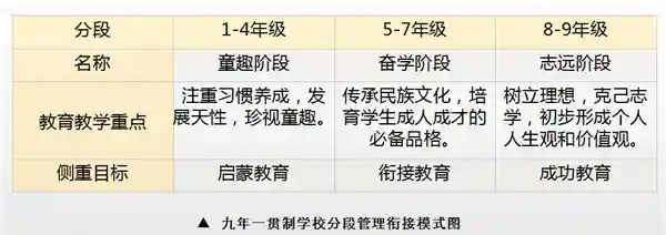 九年一贯教育教学的无痕对接,首先需要打开时间的壁垒,打破原有定式,将九年时间作为一个整体来进行通盘考虑,以期取得6+39的成效。因此可将其分为低中高三段:低段1-4年级为“童趣阶段”,中段5-7年级为“奋学阶段”,高段8-9年级为“志远阶段”。如此划分,主要是源于教育教学重点的变化:“童趣阶段”重点是启蒙教育,注重习惯养成,发展天性,珍视童趣;“奋学阶段”重点是衔接教育,传承民族文化,培育学生成人成才的必备品格;“志远阶段”重点是成功教育,树立理想,克己志学,初步形成个人人生观和价值观。以此三个阶段实现身心发展、思维方式与学习方法的对接。