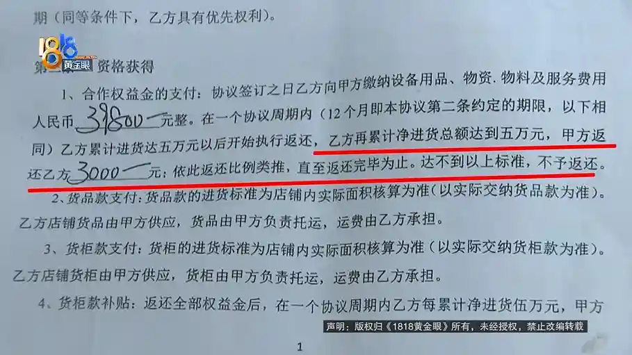 周先生:我们协议上没有写“特价商品不参加返利”几个字,如果有这几个字,我也不跟他签协议,三万九千八也不会交给他们,我们就是要求无责解约,把我交的三万九千八还给我。