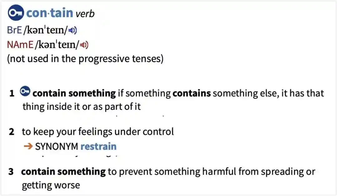 下面是《牛津词典》对contain的定义,我们看看它具备哪几种含义: