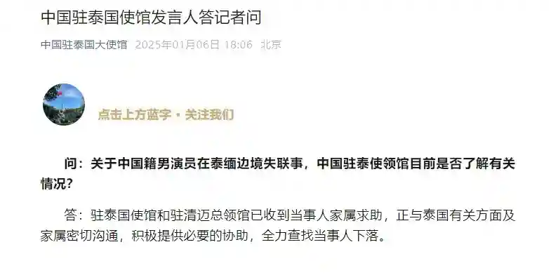 据此前报道,6日晚间,中国驻泰国大使馆发文回应称:驻泰国使馆和驻清迈总领馆已收到当事人家属求助,正与泰国有关方面及家属密切沟通,积极提供必要的协助,全力查找当事人下落。