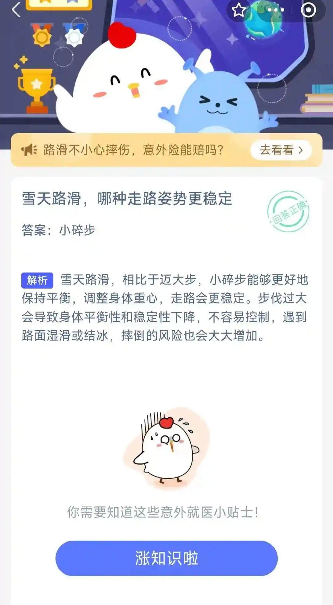 蚂蚁庄园答题:雪天路滑,哪种走路姿势更稳定正确答案:小碎步✔️