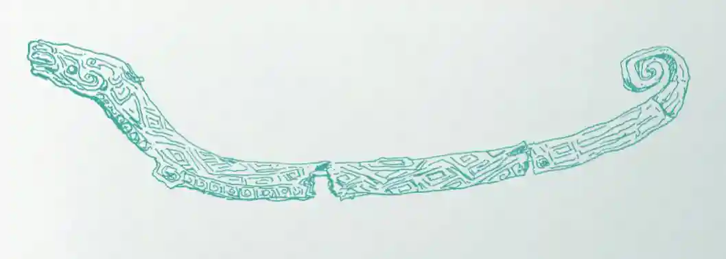 现藏于三星堆博物馆。该器残为三段,蛇头部宽大,微上昂,头上有耳,长眼,眼球呈圆形凸起,左颈下有一环钮。蛇身饰菱形云纹,两侧腹部各有一排鳞甲。蛇尾上翘并向前内卷。蛇的造型颇具写实风格,尾前端两侧饰卷云纹,尾上两侧各有两条凹纹,贯通至尾尖。