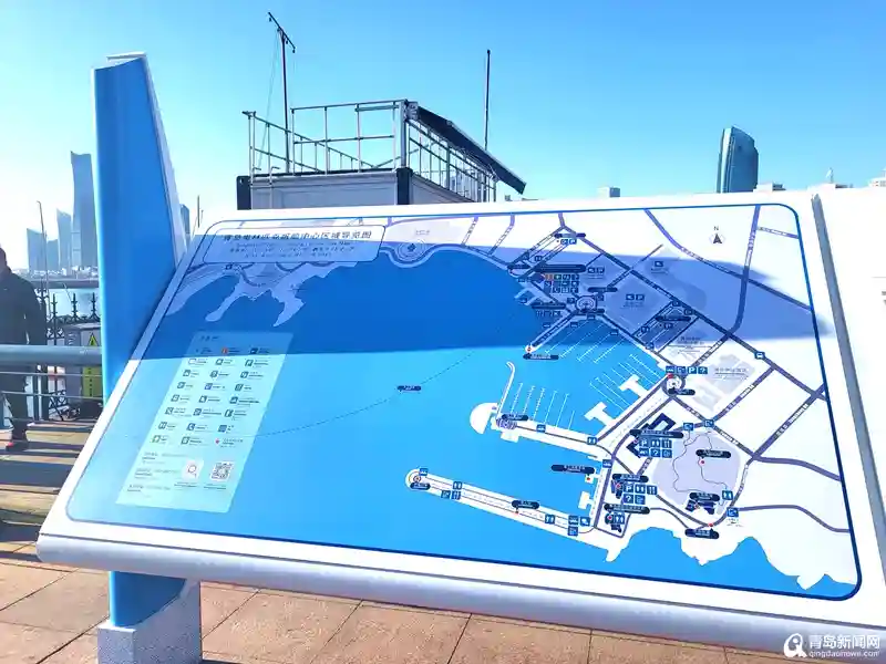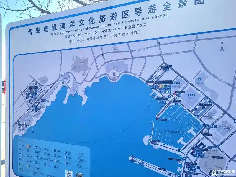 在奥帆中心内各处翻新后的指示牌中,可以明显看到采用了中文、英语、日语、韩语四种语言翻译每一处文字内容,为来到青岛的外国游客提供了贴心的服务和帮助。在设计整洁干净的导览图中,周边商场、酒店都运用了四种语言进行注释,彰显着青岛这座城市的开放和现代。