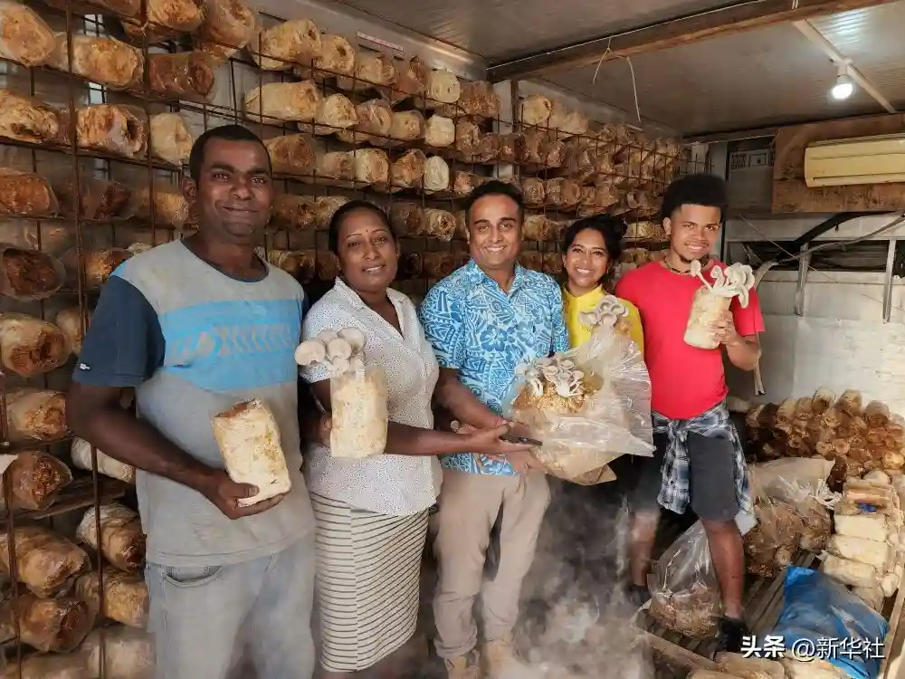 2022年5月11日,在斐济第三大城市楠迪,一家斐济蘑菇公司员工展示在中国援斐菌草技术示范中心项目帮助下种植的蘑菇。新华社记者张永兴摄