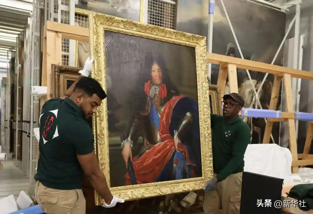 2024年3月11日,在法国巴黎近郊的凡尔赛宫,工作人员准备打包油画《路易十四戎装像》。在2024年中法建交60周年暨中法文化旅游年之际,凡尔赛宫和故宫博物院将于4月至6月在故宫共同举办“凡尔赛宫与紫禁城”展览。凡尔赛宫工作人员将70余件法方展品打包装箱,计划在不久之后将其运往北京。新华社记者高静摄