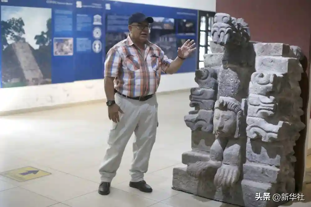 2023年6月8日,在洪都拉斯科潘遗址入口陈列厅,洪都拉斯人类学和历史研究所西部地区代表萨尔瓦多·马丁内斯介绍联合考古队发现的龙头雕像。新华社发(卢西奥·塔沃拉摄)