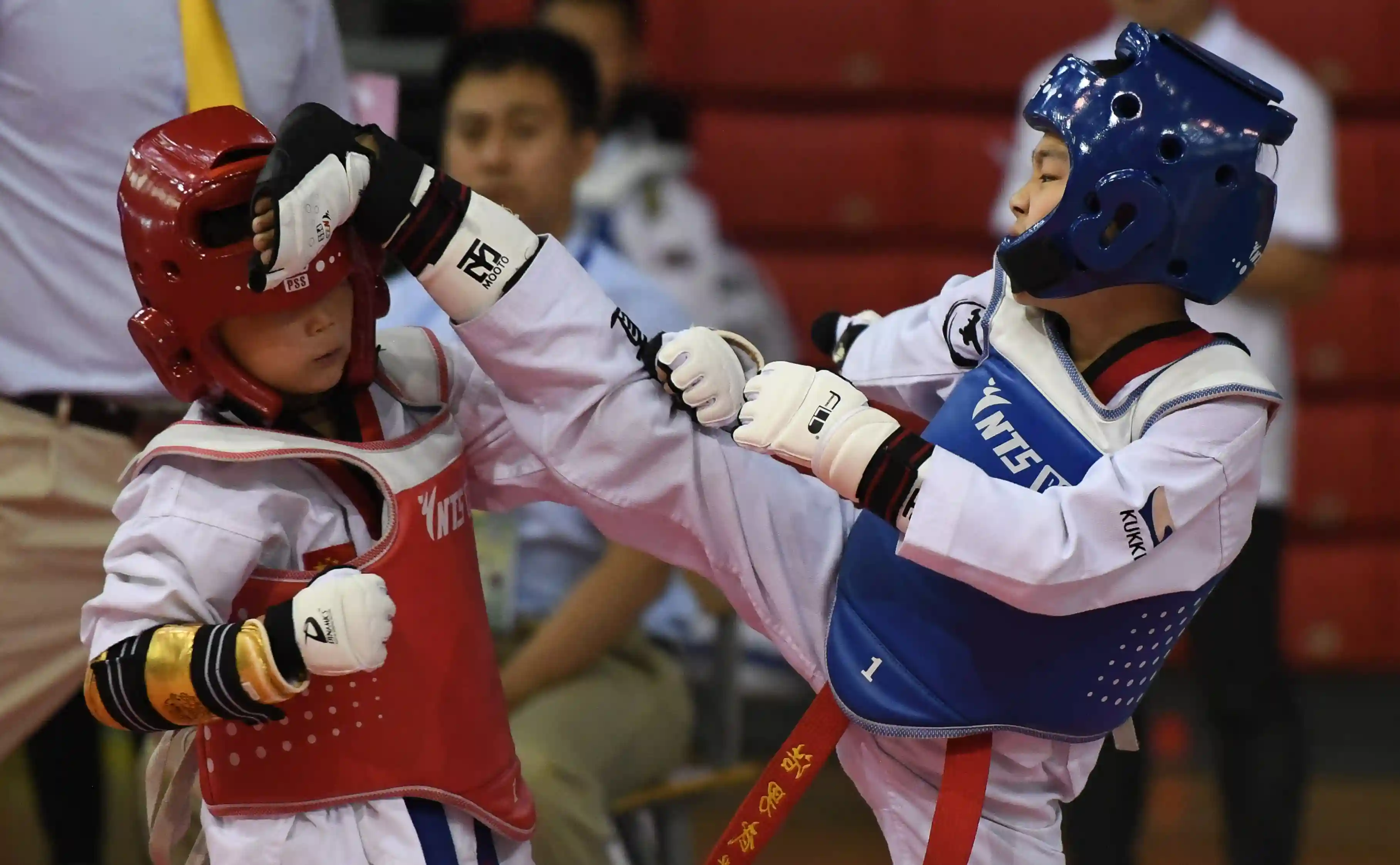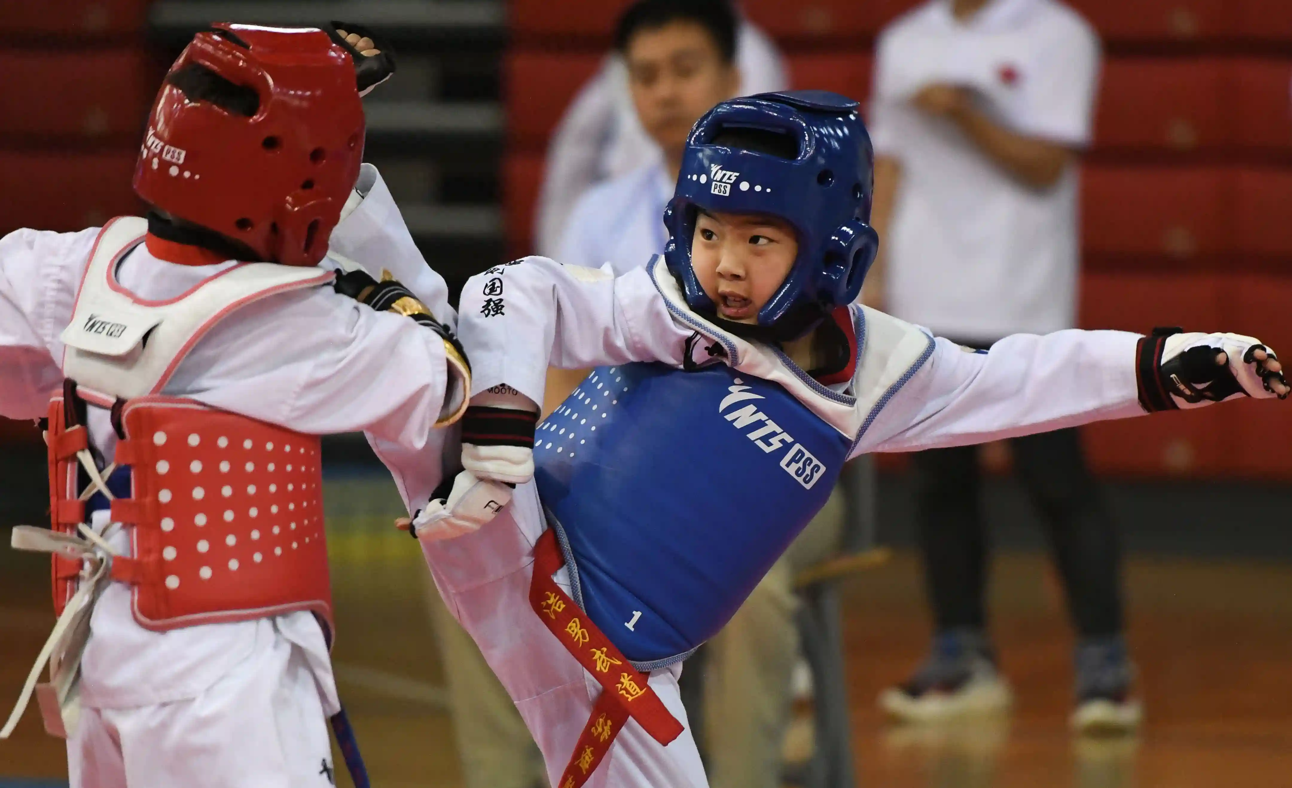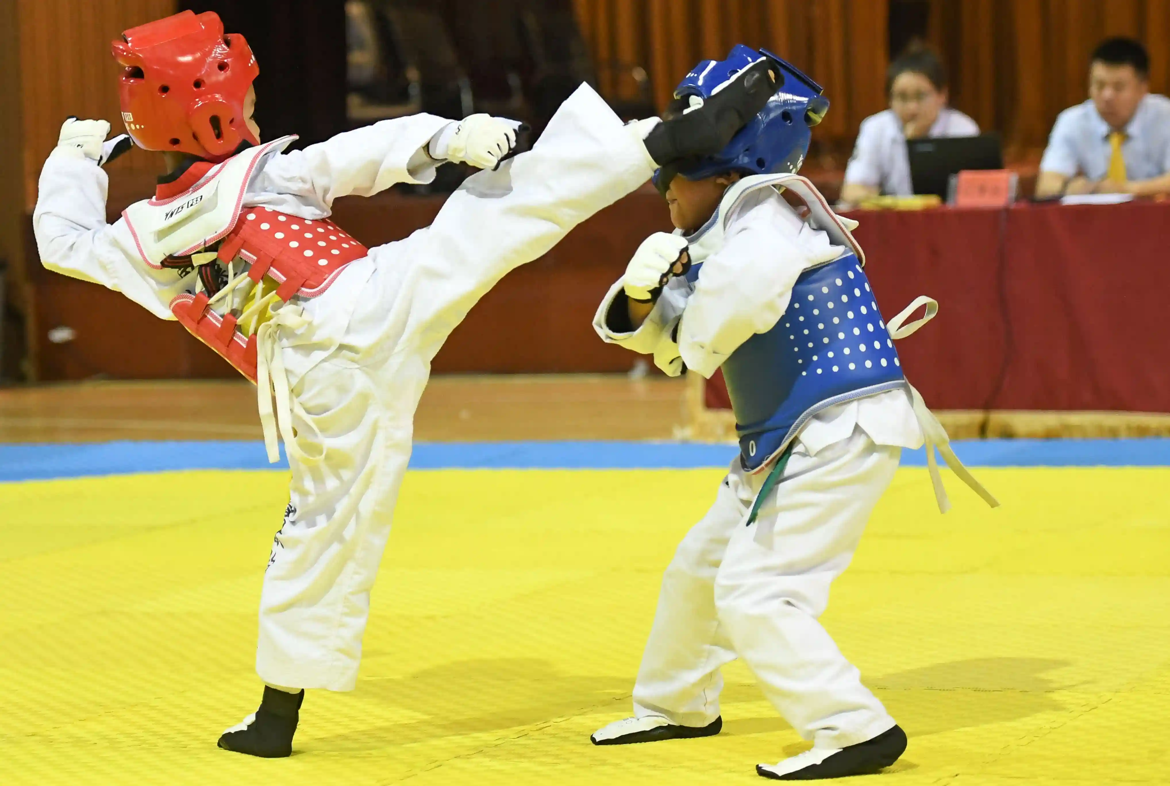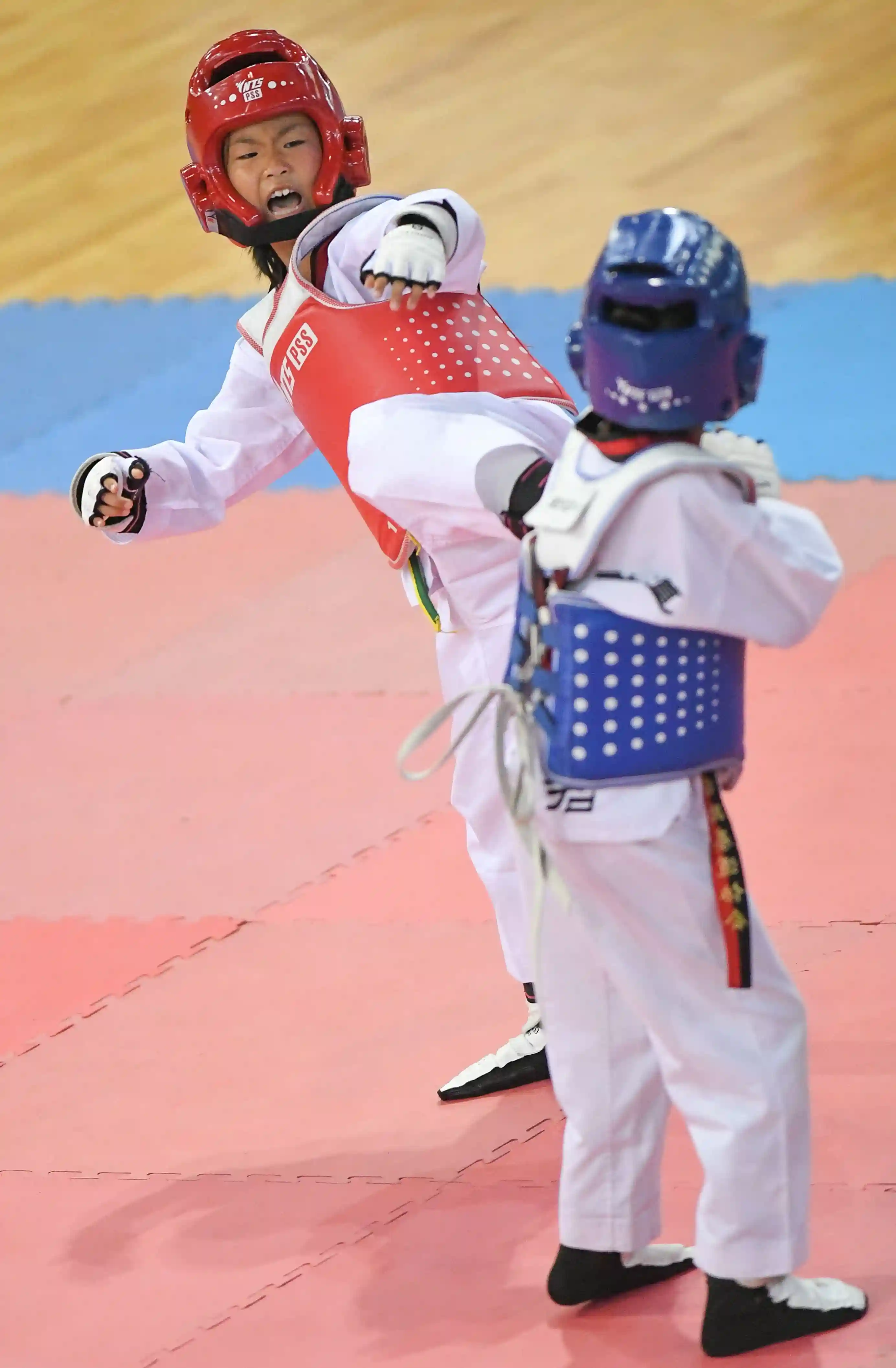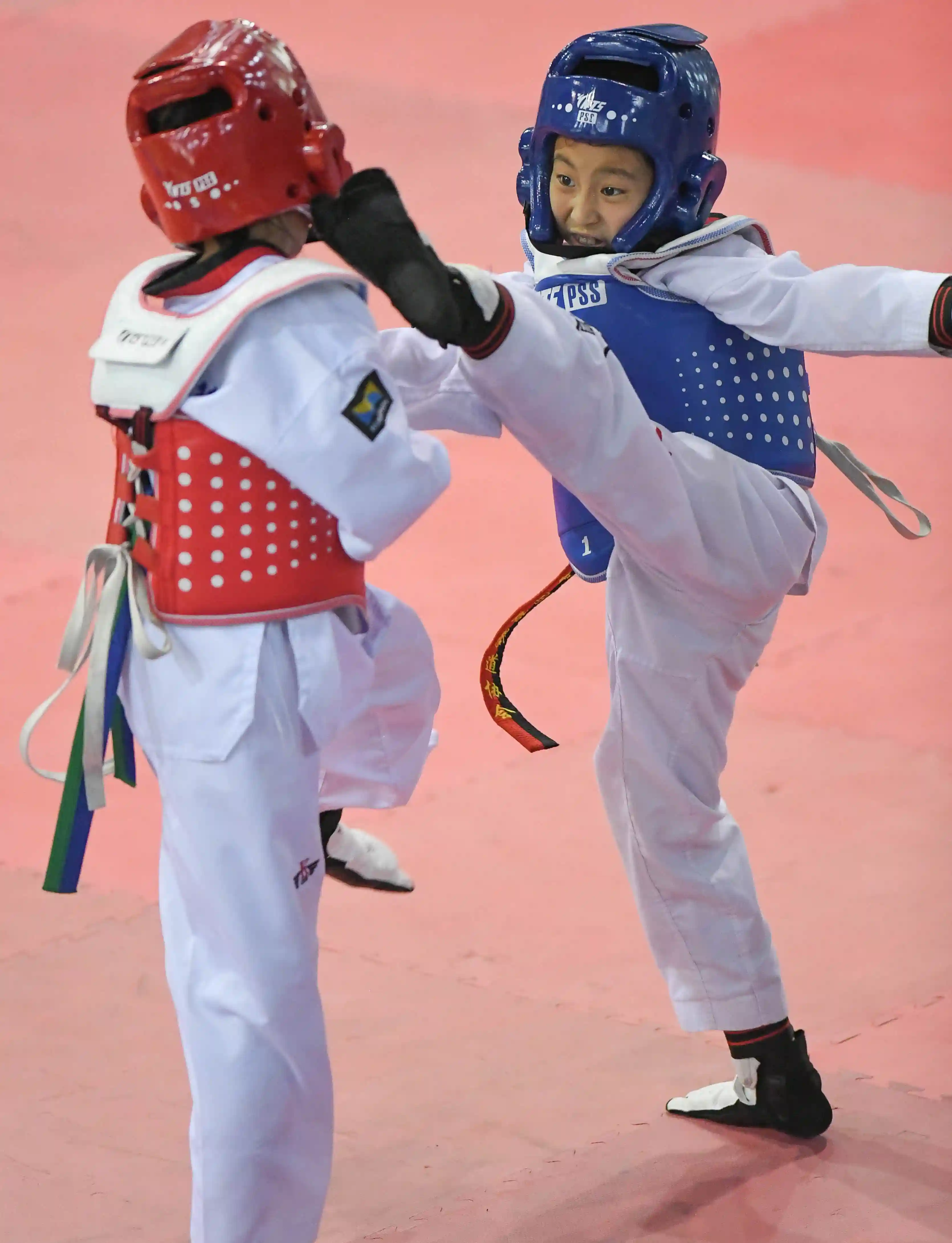 新华社照片,长春,2019年7月17日(体育)(6)跆拳道——快乐暑假踢!踢!踢!7月17日,长春九台区实验小学选手任泉宇(左)在比赛中进攻。当日,2018-2019年中国中学生跆拳道联赛吉林省分站赛暨小学生训练营在长春开幕。比赛由中国中学生体育协会主办,吉林省跆拳道协会承办,来自204支代表队(跆拳道馆)的731名选手将参与品势、竞技、电子竞速等项目的角逐,为暑假生活增添乐趣。新华社记者王昊飞摄