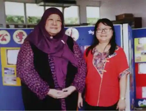 莎莉娜(左)在直落甘望中华公学五年级时转校,但她时而也会重返小学探望师长们。右者为现任直落甘望中华公学校长许秀兰。(马来西亚《》)