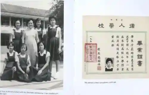 莎莉娜从直落甘望中华公学转校至循人学校,继续其华文教育之路,并获得小学毕业证书。照片中的莎莉娜(站者右一)与老师和同学合影。(马来西亚《》)