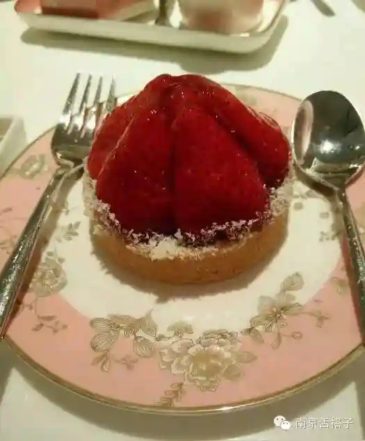 先要为大家介绍的是看似普通却会给你带来惊喜的新鲜水果塔。整体看上去水果塔比较简单,新鲜的草莓和底部的面包堆砌而成。但味道是真的不一般。草莓新鲜,所以水份很充足,外面包裹上了一层亮晶晶的糖稀,所以吃起来的味道也带着糖的甜味。中间滑嫩的塔酱又增加了绵密的口感。最底下麦香味十足的面包底,单吃会有一点点硬口,但是与上面搭配的塔酱的水果结合在一起,软硬适宜,口感非常的丰富,旁边所蘸上的椰蓉也让这道甜点更有惊喜。