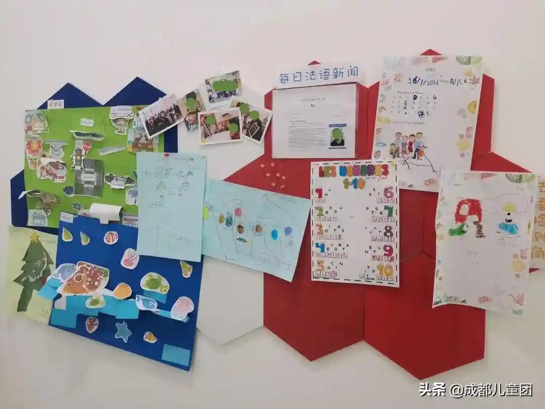 在教学区的走廊转一圈,墙上贴着“今日法语新闻”、小朋友们做的小语种手抄报和绘画。站在门外透过不同教室的窗户,能清晰的看到不同孩子学习的不同语言,差不太多的桌椅,但高中生的教室与小朋友的教室却透露着截然不同的两种氛围,一个稍显安静,另一个活泼而欢快,仿佛透露出对世界初探的欣喜。