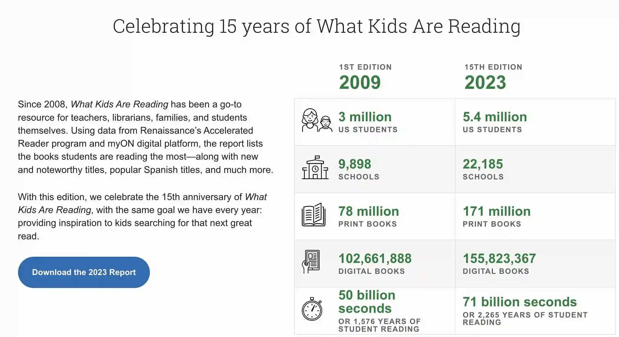 自2009年发布第一版以来,Renaissance每年都会发布一份最新的《孩子们在阅读什么》,这份报告也一直都是教师、图书管理员、家长和学生们的首选参考阅读书单。