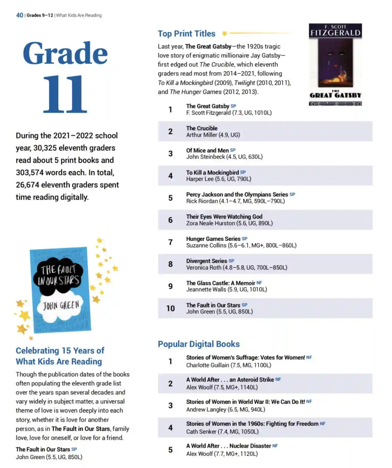 最受Grade11年级(高二)学生喜欢的TOP5纸质书籍分别为: