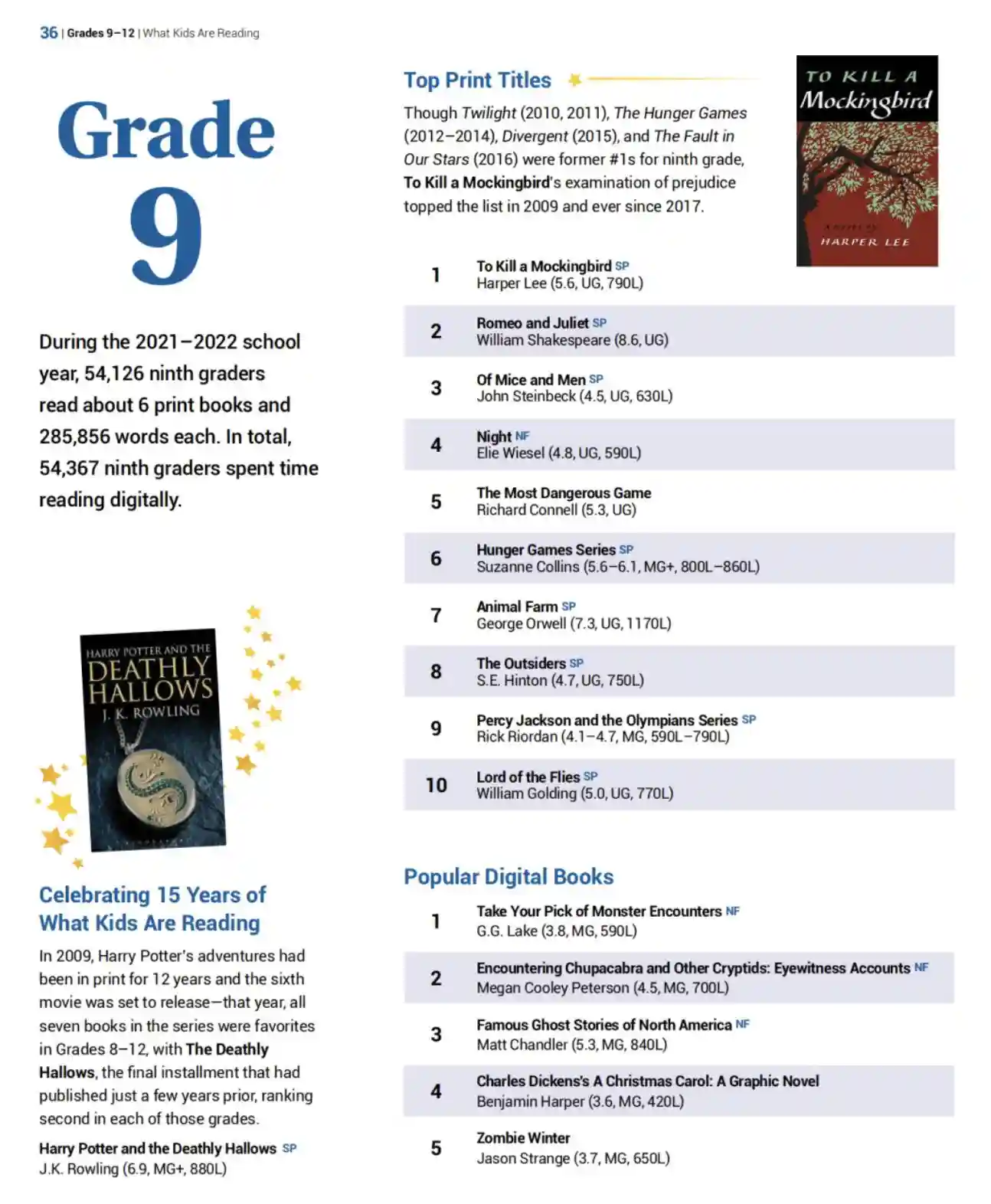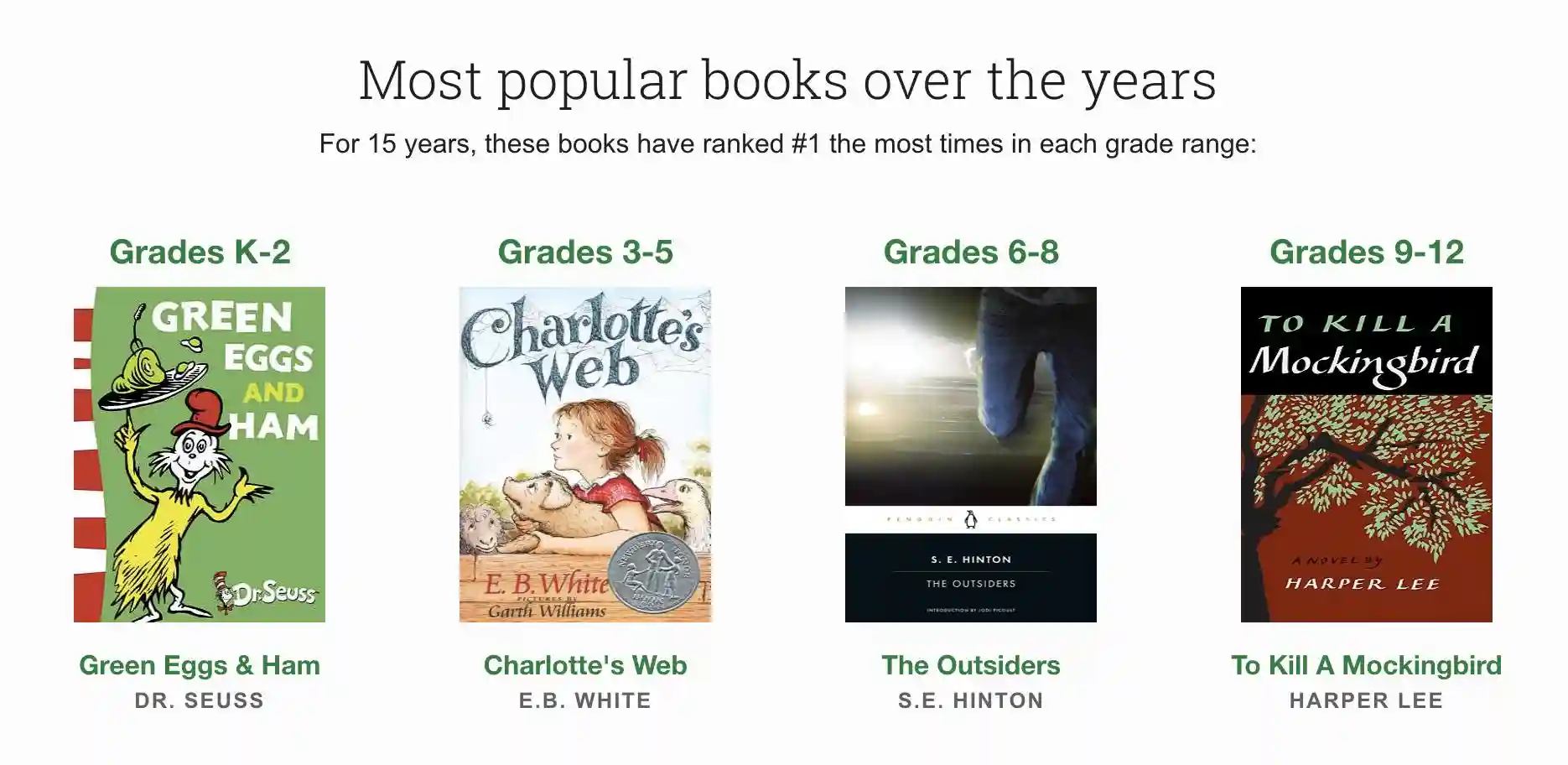 15年来,K-12各年级最受欢迎的第一名书籍分别为: