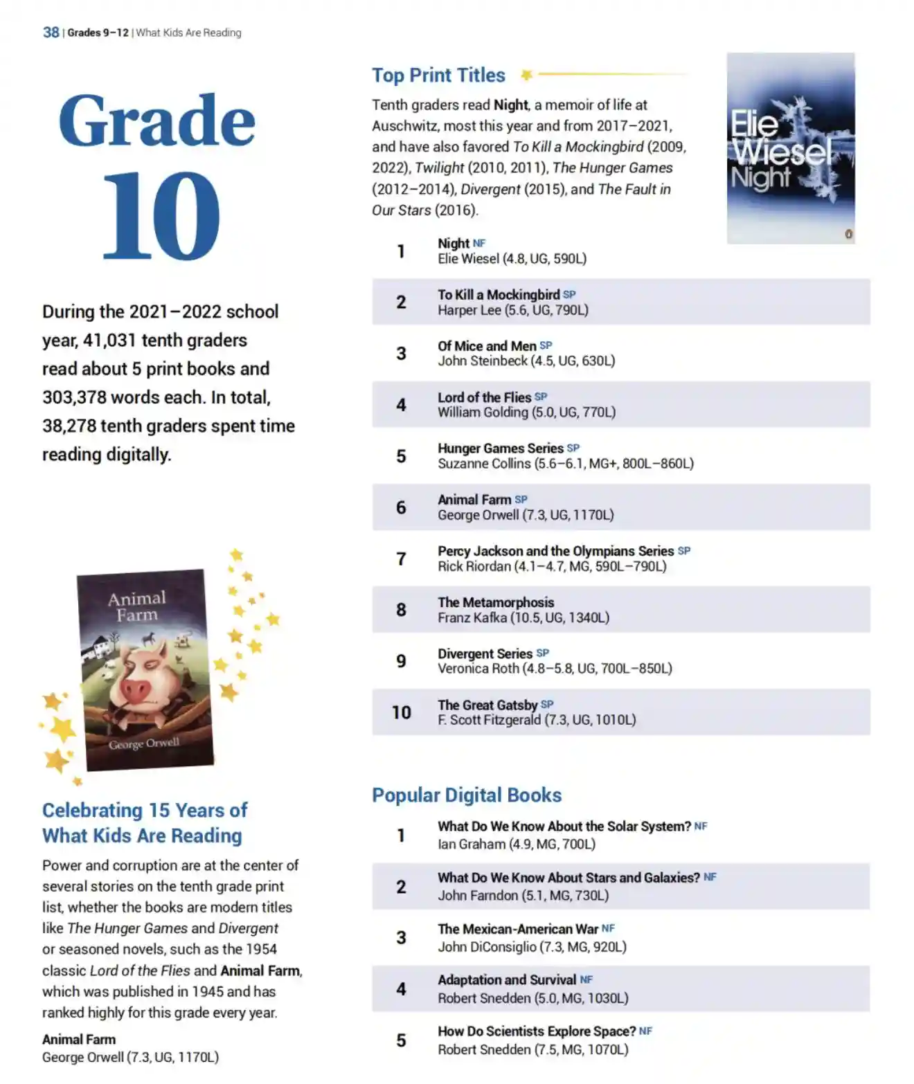 最受Grade10年级(高一)学生喜欢的TOP5纸质书籍分别为: