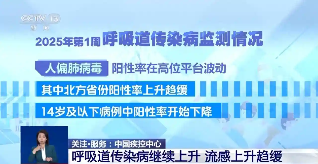 中国疾控中心9日发布了2025年第1周呼吸道传染病监测情况。全国急性呼吸道传染病哨点监测结果显示,