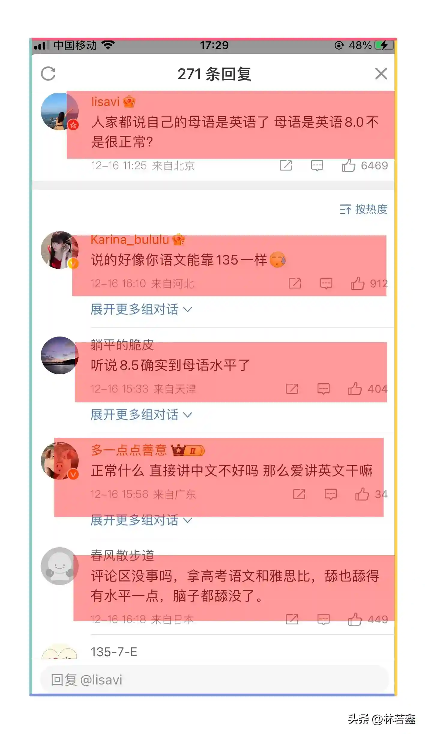 也有网友想起了小s二女儿曾经说过的话,她说她的母语是英语,当时引发不调的热议,于是不少网友说既然是母语,那考8.0分也不奇怪,就和语文考试135分类似,也有网友觉得不能这么相提并论,一时间热议不断!