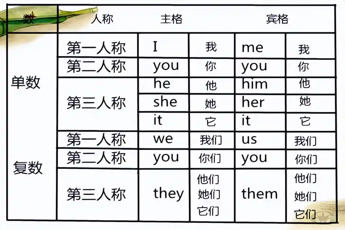 格的概念:格就是指位置,人称代词分为主格和宾格,主格就是在主语的位置上,宾格就是在宾语的位置上。以上的人称代词都是主格的形式。对应的宾格形式如下: