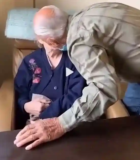 当护理中心允许家属拜访时,爷爷立马赶去看奶奶,亲吻她,紧紧握住她的手。