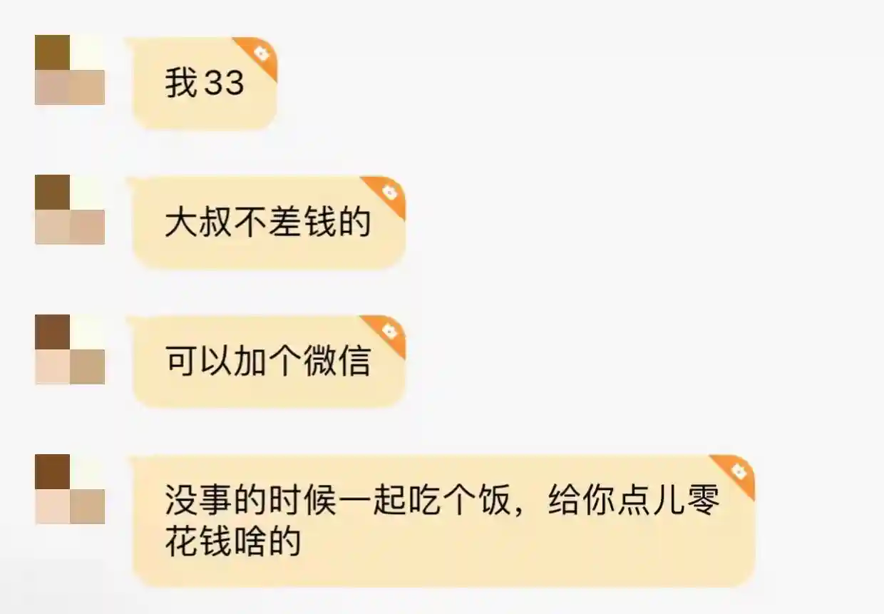 除了直接的性骚扰外,14岁女孩所收到的信息中还有不少“好哥哥”、“好叔叔”类型——聊天者们会假装自己对女孩很好,提醒她提防坏人,同时又不断地用言语、金钱诱导她。